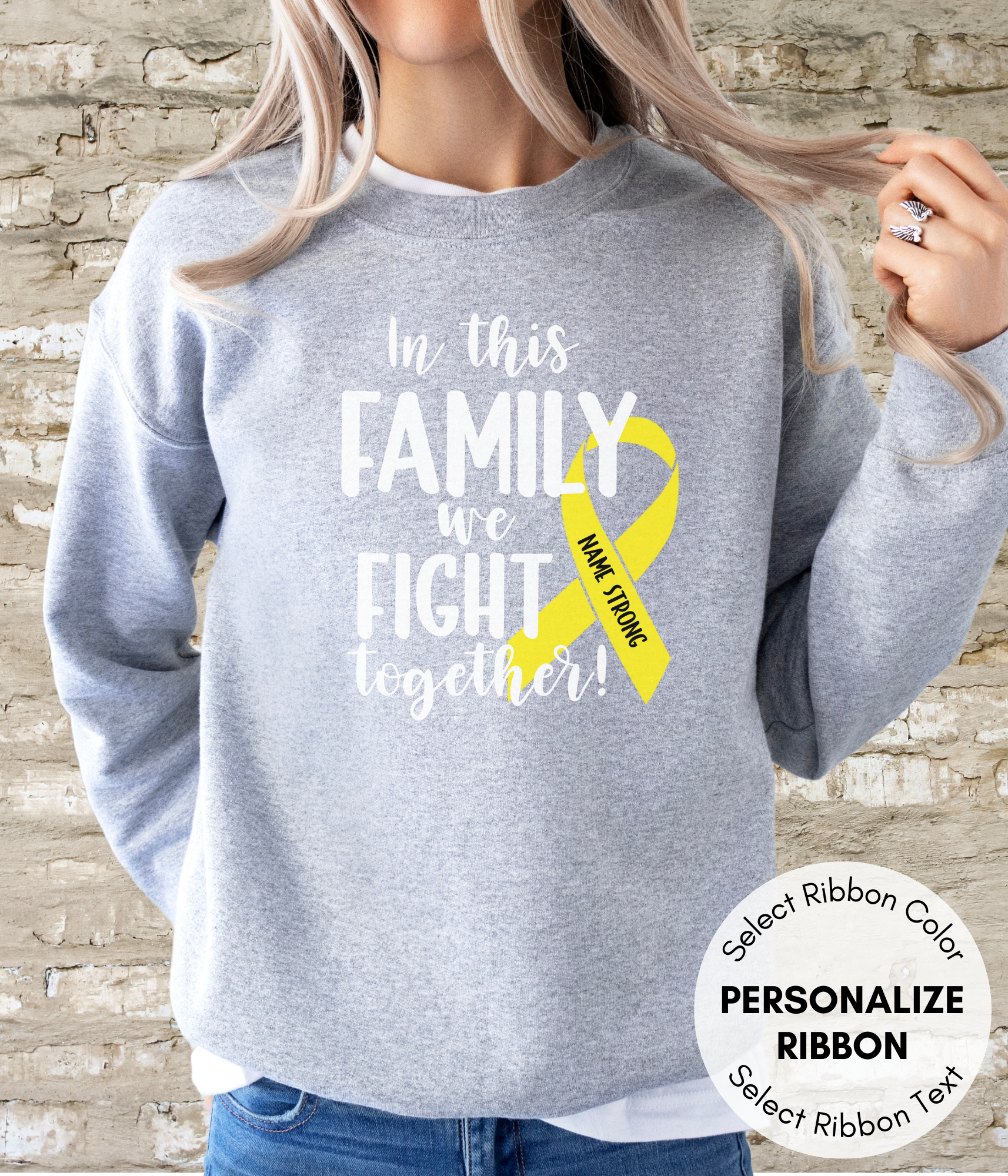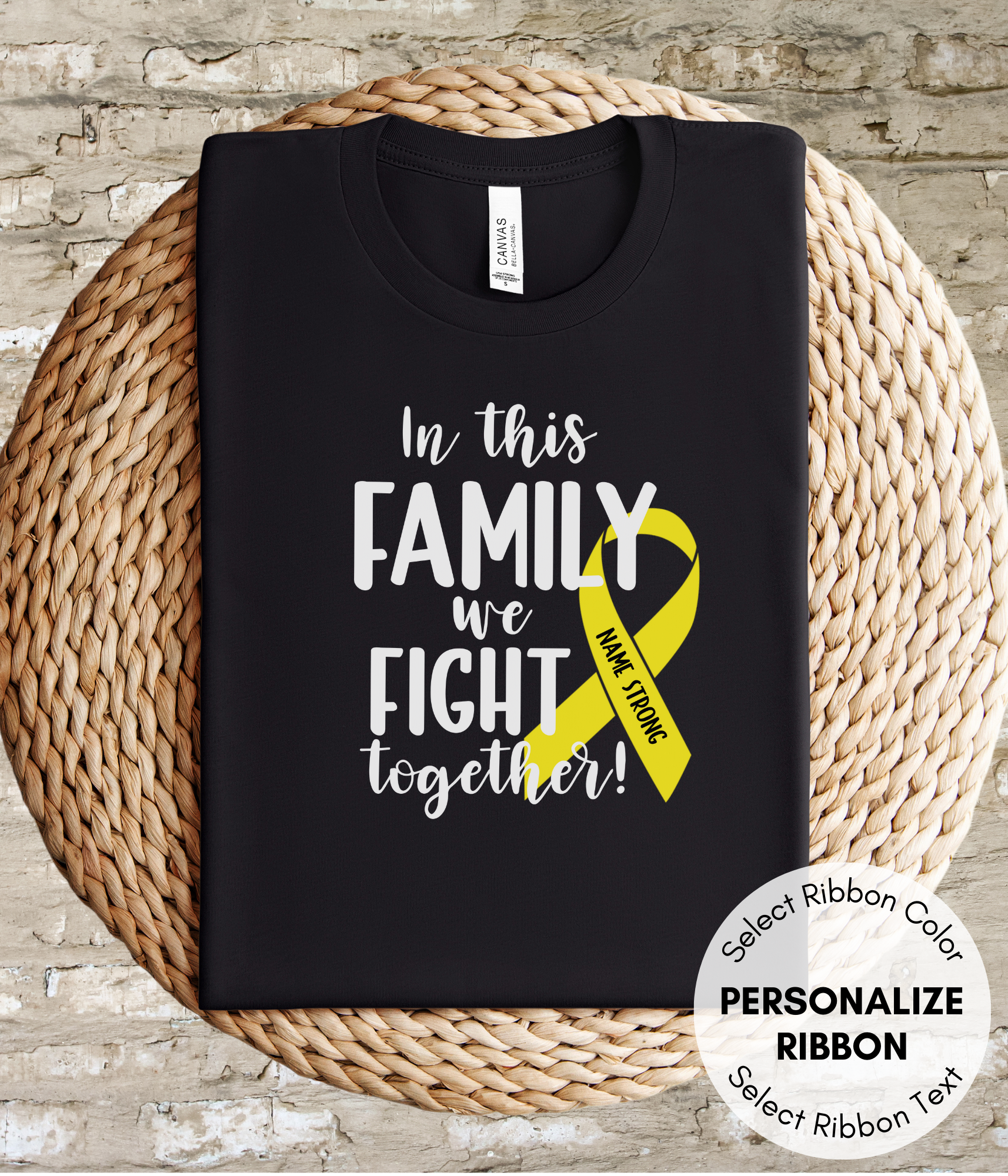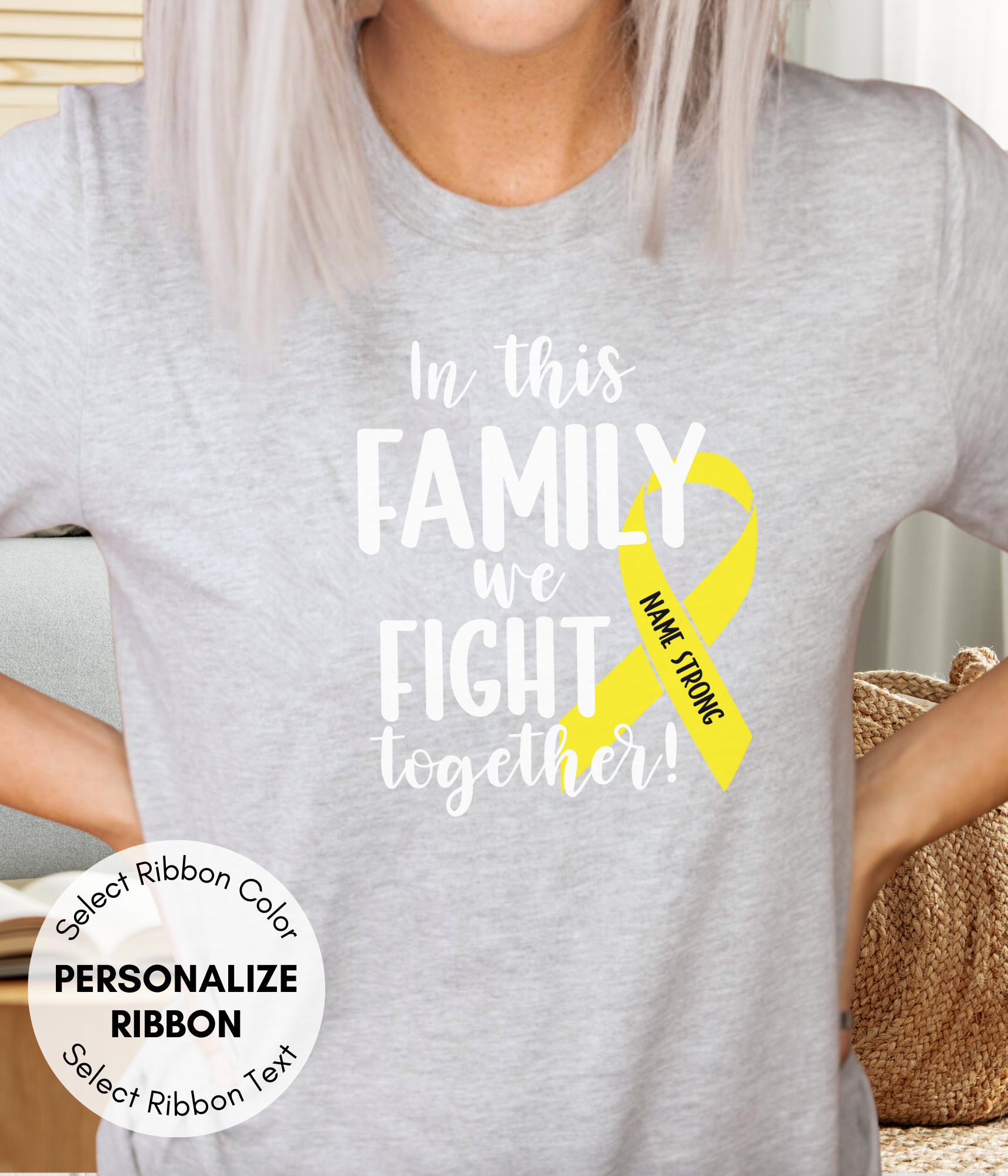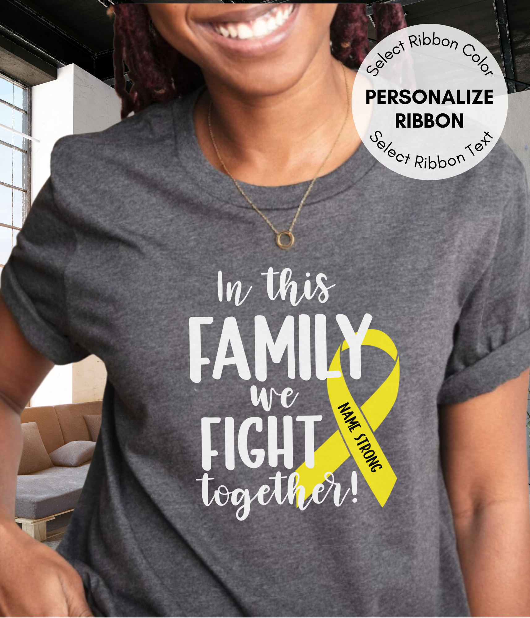 • Support your loved one in style with this Bone Cancer shirt personalized with their name in the ribbon. Our 'In this Family We Fight Together' unisex tee shirt is the perfect blend of comfort and purpose. Perfect for ordering in bulk to make a large supportive statement.
