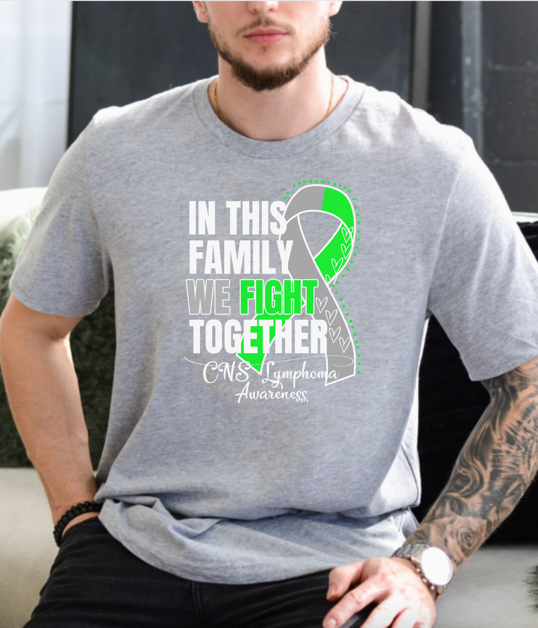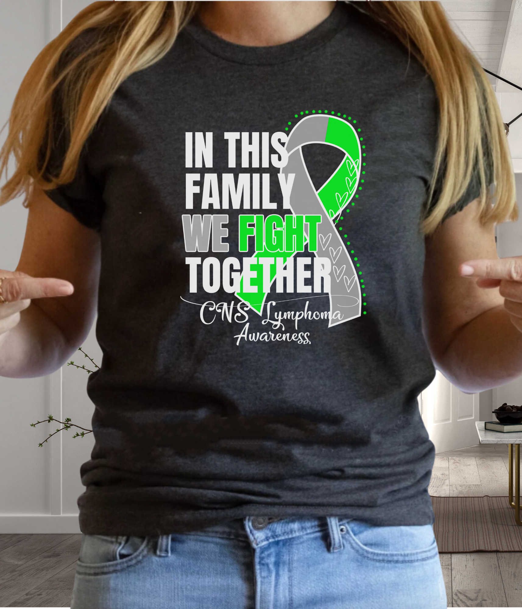 • Support your loved one in style with this Central Nervous System Lymphoma shirt. Our 'In this Family We Fight Together- CNS Lymphoma Awareness' unisex tee is the perfect blend of comfort and purpose.