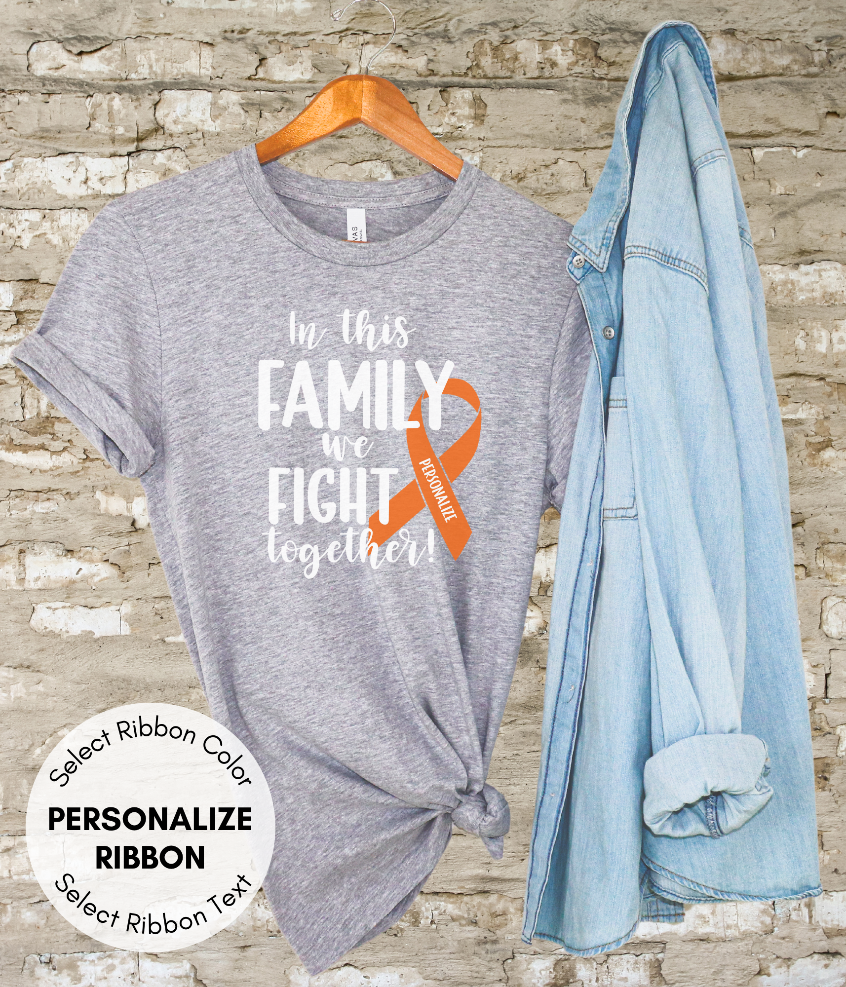 • Support your loved one in style with this Kidney Cancer shirt personalized with their name in the ribbon. Our 'In this Family We Fight Together' unisex tee is the perfect blend of comfort and purpose. Perfect for ordering in bulk to make a large supportive statement.