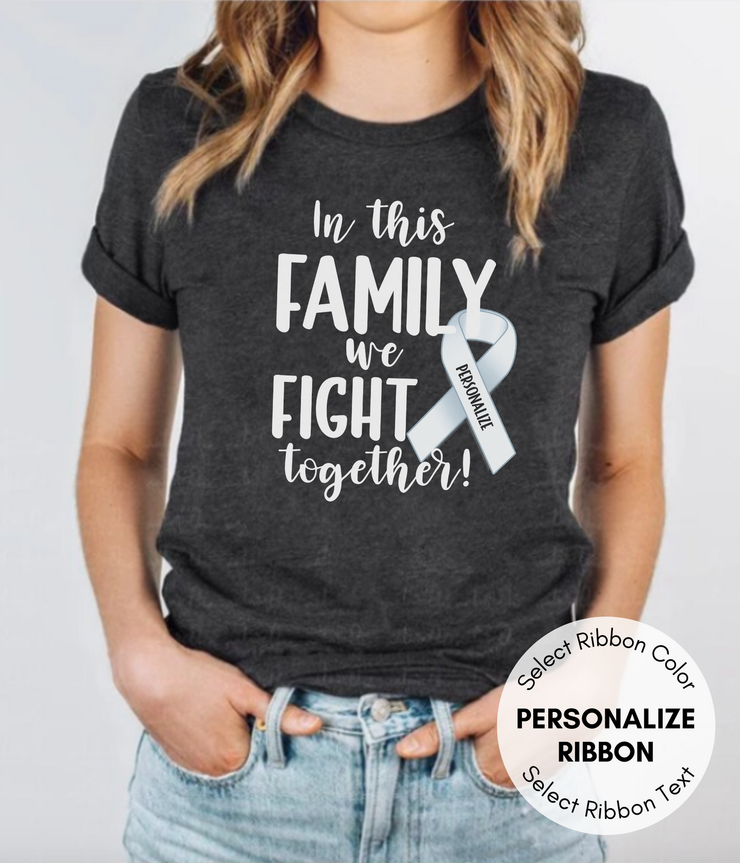 • Support your loved one in style with this Lung Cancer shirt personalized with their name in the ribbon. Our 'In this Family We Fight Together' unisex tee is the perfect blend of comfort and purpose. Perfect for ordering in bulk to make a large supportive statement.