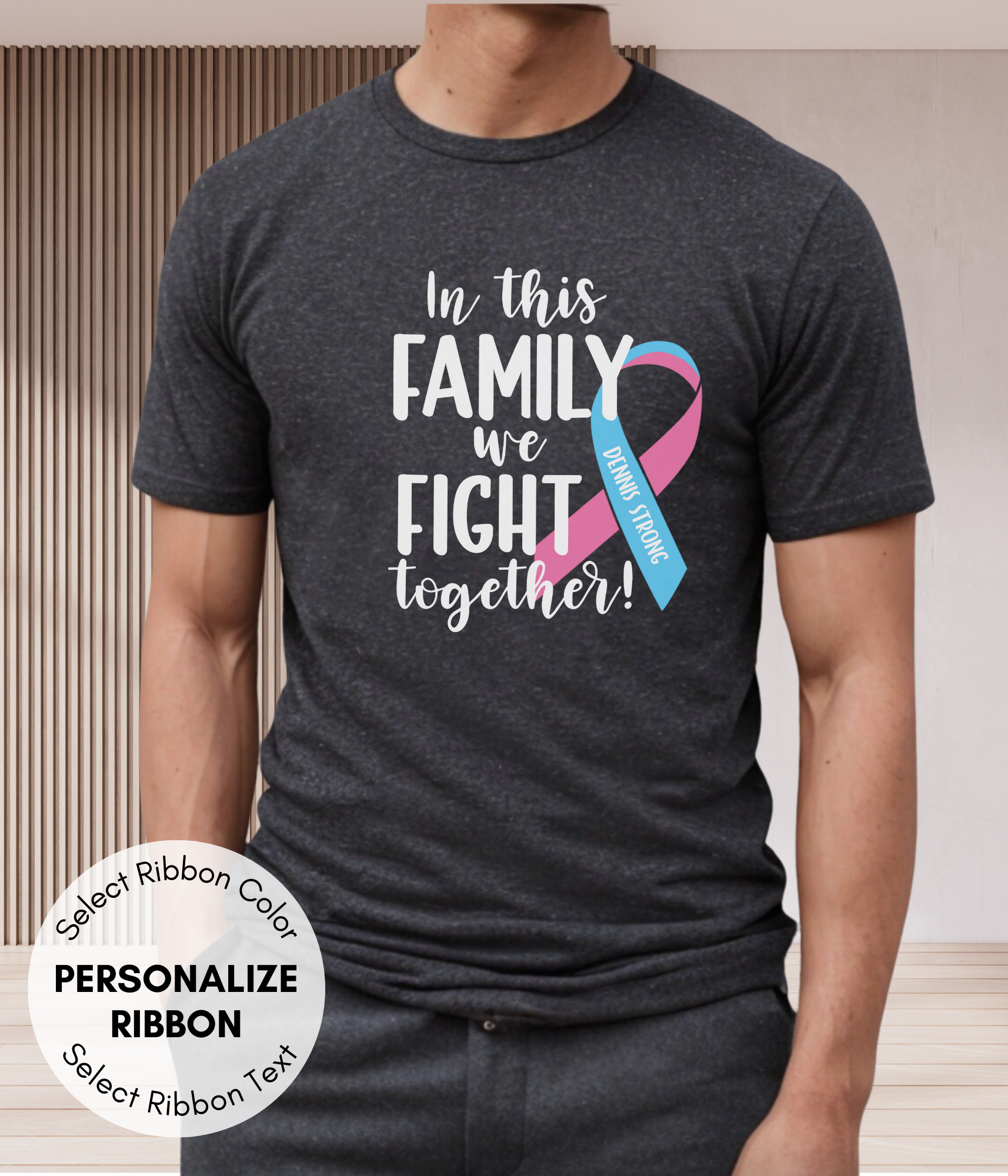 • Support your loved one in style with this Male Breast Cancer shirt personalized with their name in the ribbon. Our 'In this Family We Fight Together' unisex tee is the perfect blend of comfort and purpose. Perfect for ordering in bulk to make a large supportive statement.