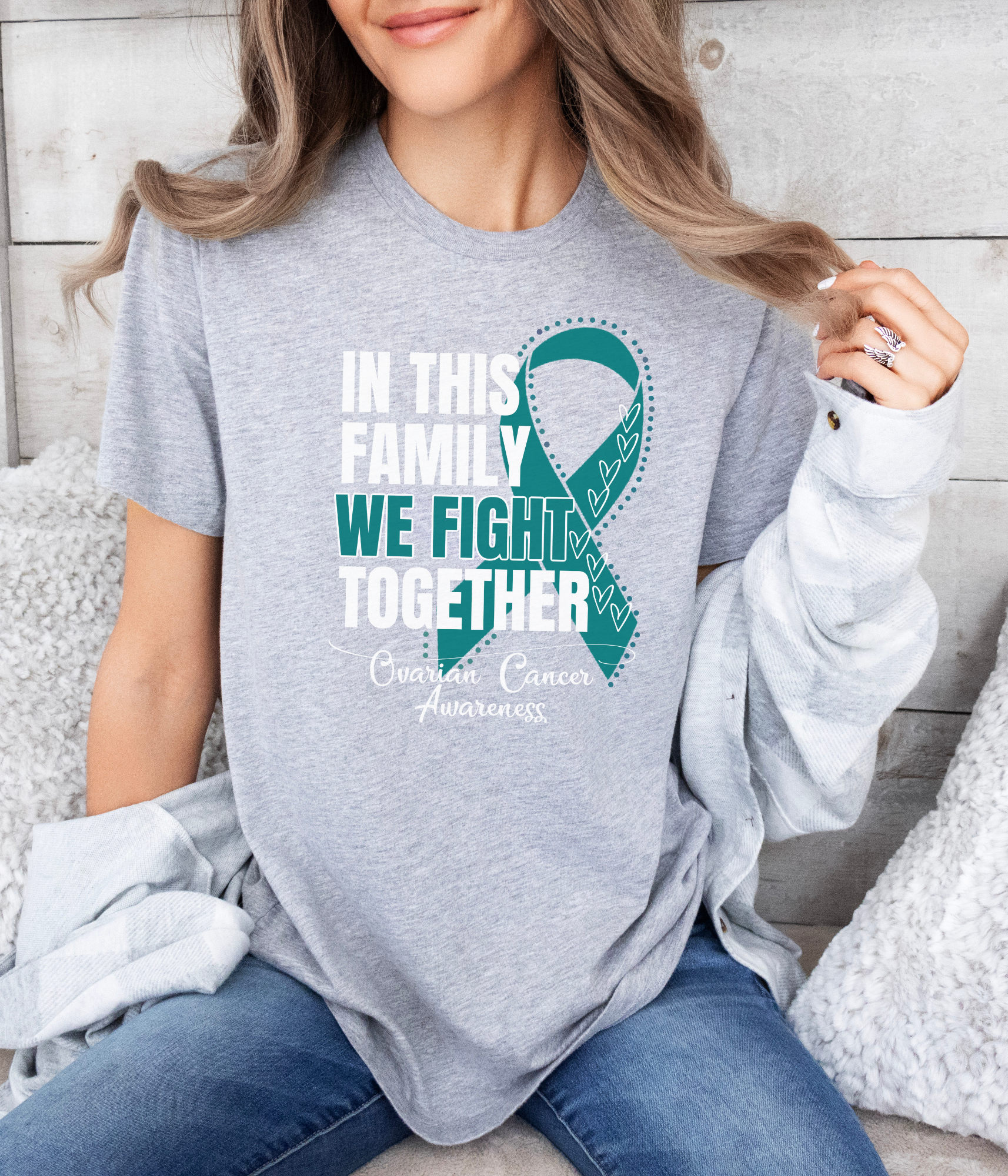 • Support your loved one in style with this Ovarian Cancer shirt. Our 'In this Family We Fight Together- Ovarian Cancer Awareness' unisex tee is the perfect blend of comfort and purpose.