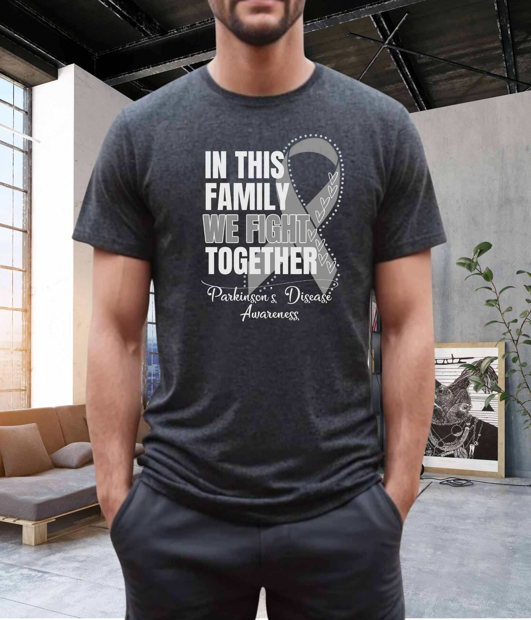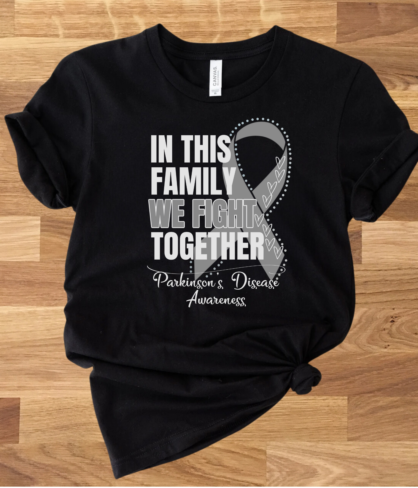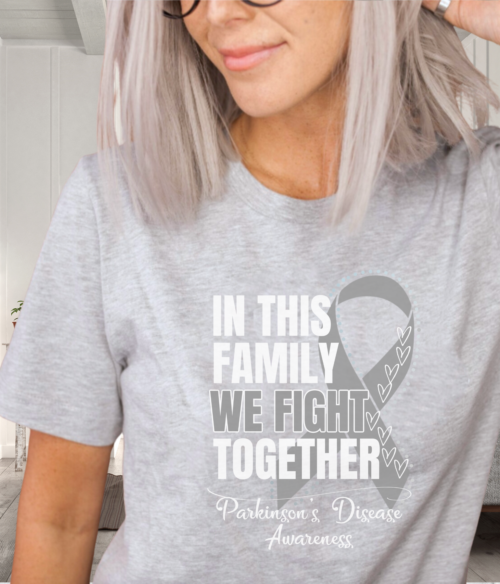 • Support your loved one in style with this Parkinson's Disease shirt. Our 'In this Family We Fight Together- Parkinson's Disease Awareness' unisex tee is the perfect blend of comfort and purpose.