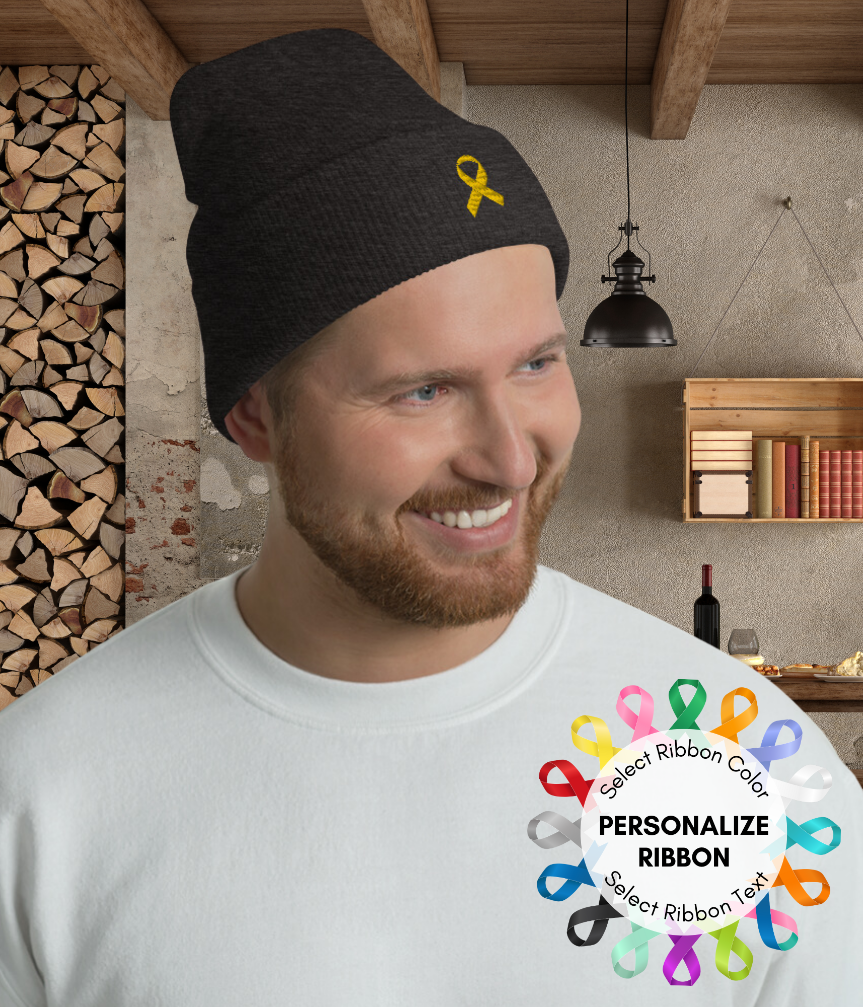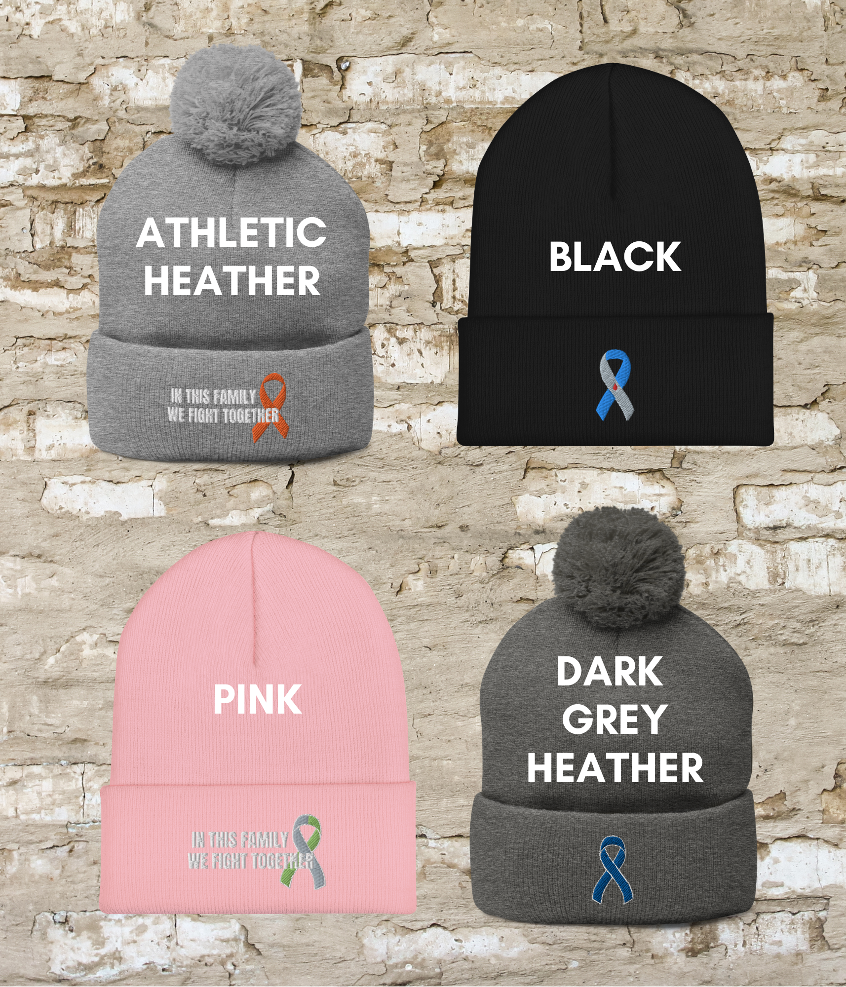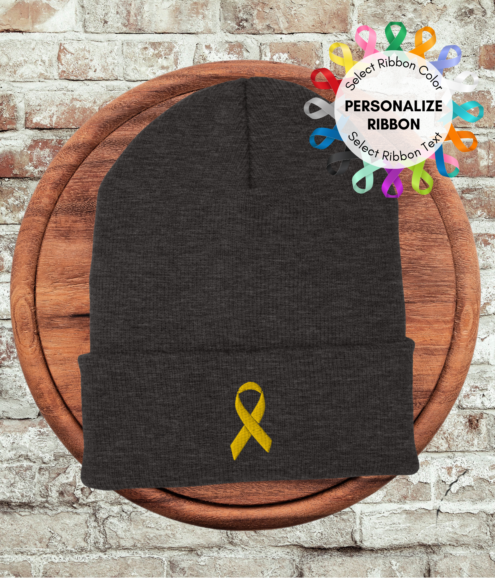 • Support your loved one in style with this custom embroidered awareness ribbon cuffed beanie winter hat. Featuring the diagnosis unique to you or your loved one- this "one size fits most" winter hat is available with or without attached pom-pom.  Order one or order in bulk to make a large supportive statement.