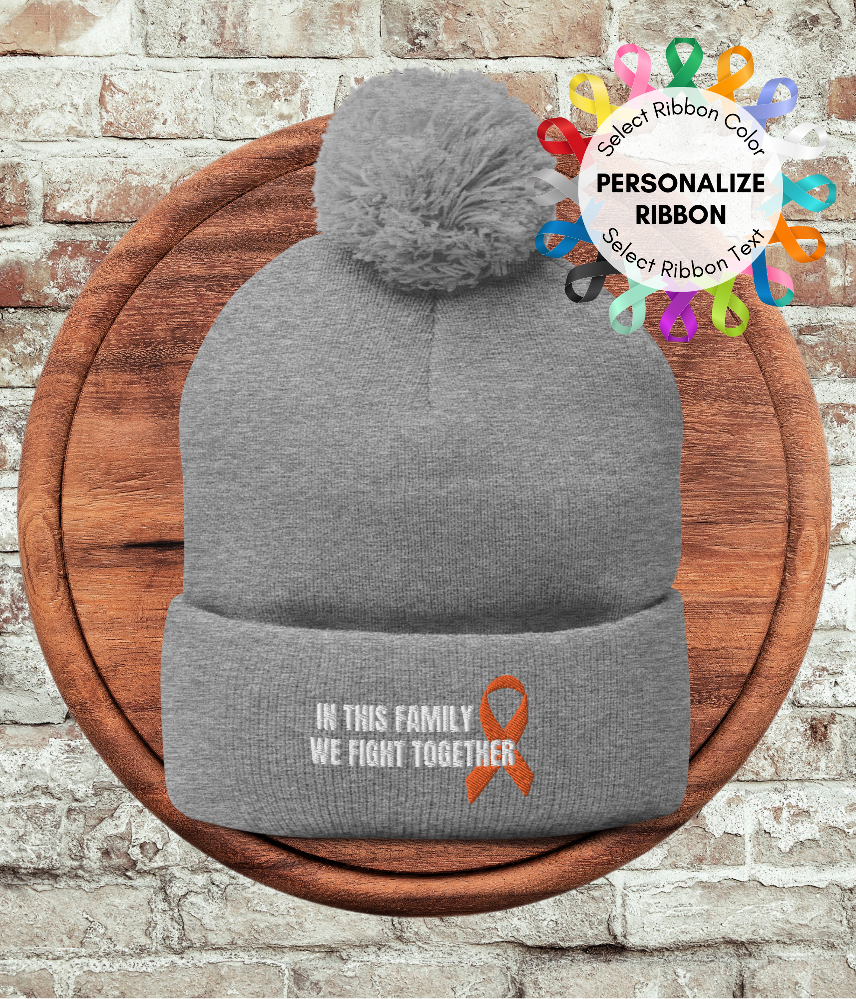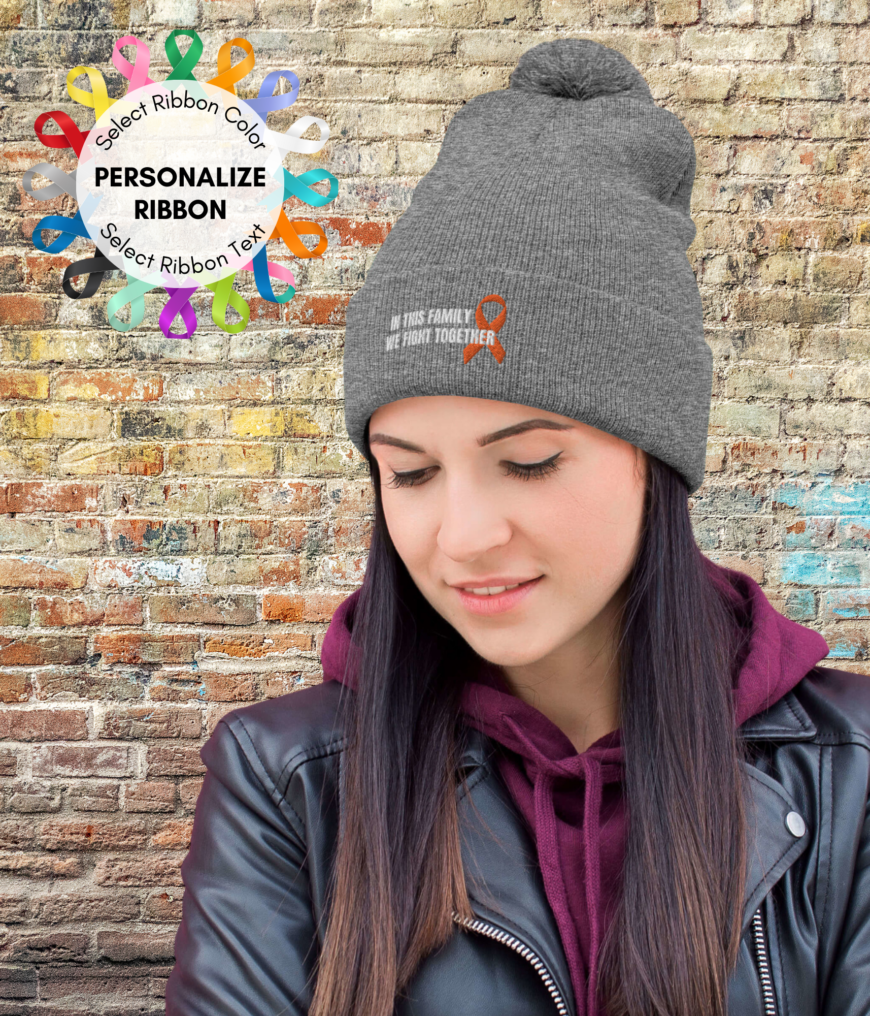 • Support your loved one in style with this custom embroidered awareness ribbon cuffed beanie winter hat reading, "In this family we fight together". Featuring the diagnosis unique to you or your loved one- this "one size fits most" winter hat is available with or without attached pom-pom.  Order one or order in bulk to make a large supportive statement.