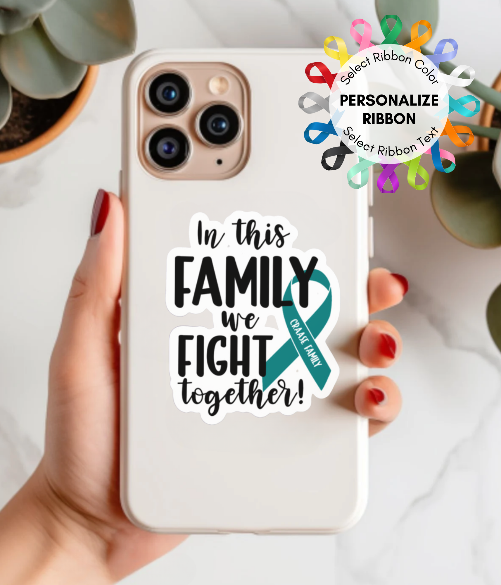 • Support your loved one in style with this trademarked and personalized "In this family we fight together" 3x3 ribbon sticker. Order one or order in bulk to hand out to family and friends to help show their support and make a large supportive statement. Perfect to put on electronic devices, water bottles, journals, cell phones, and so much more!