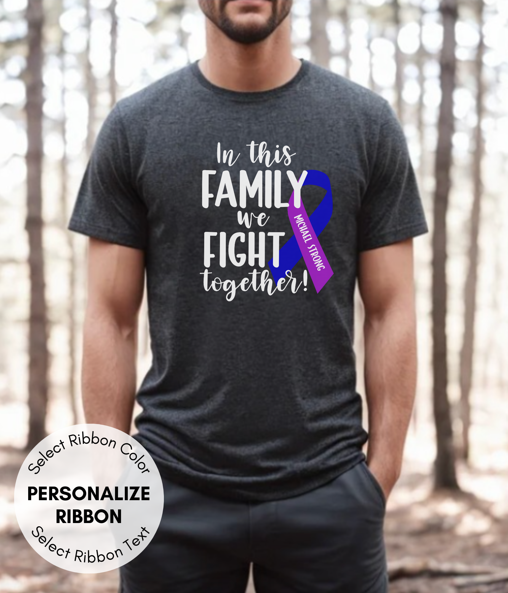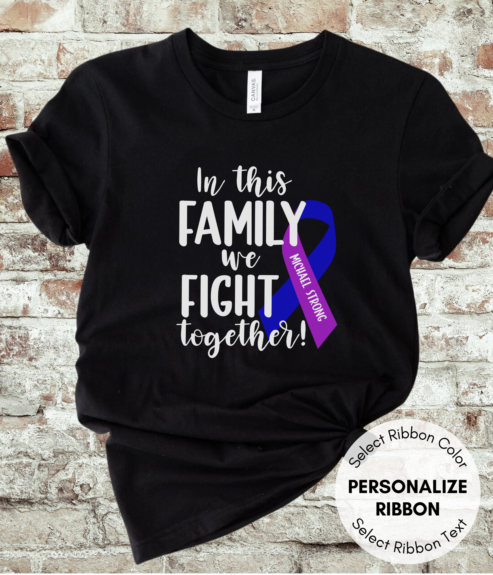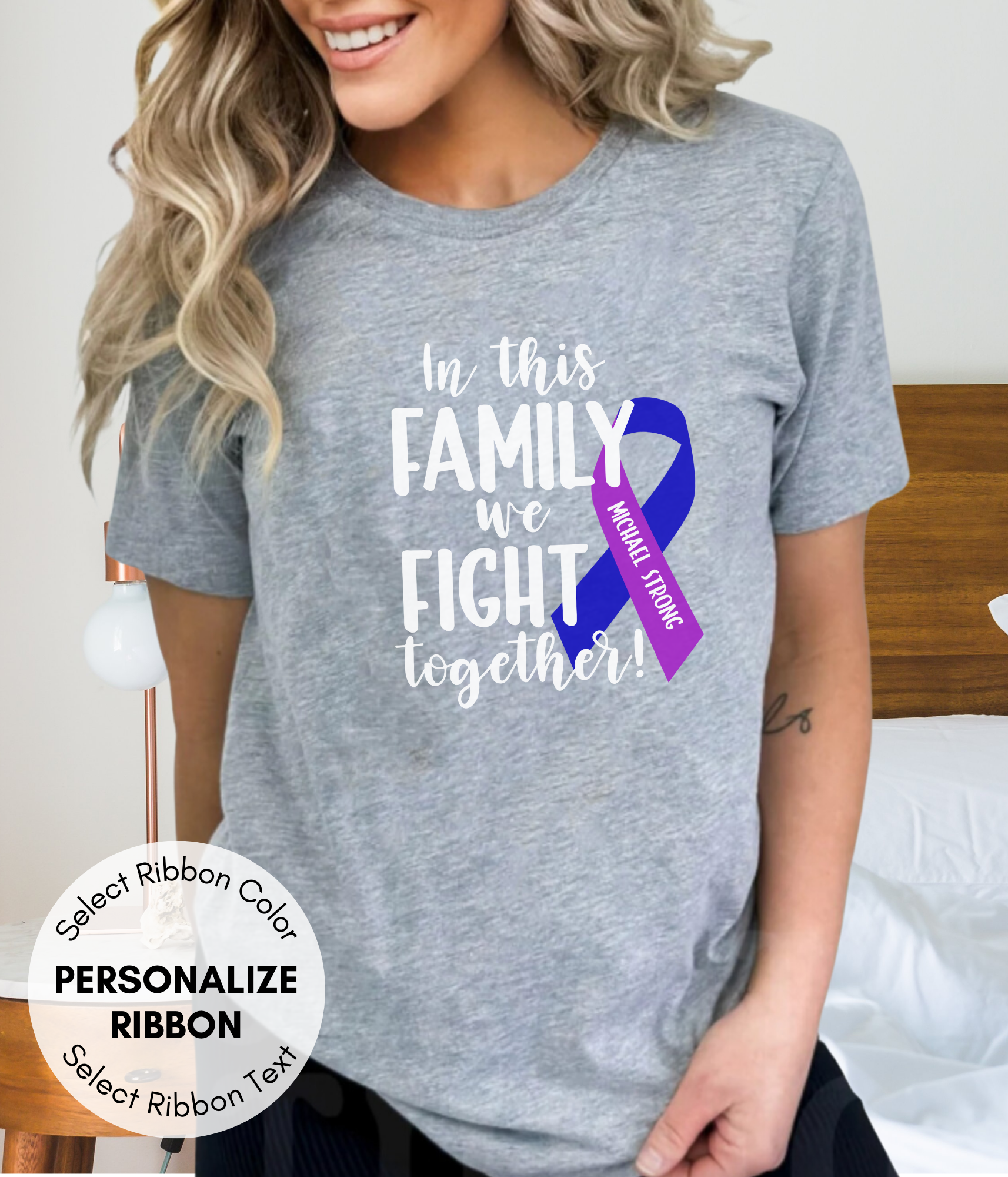 • Support your loved one in style with this Rheumatoid Arthritis shirt personalized with their name in the ribbon. Our 'In this Family We Fight Together' unisex tee is the perfect blend of comfort and purpose. Perfect for ordering in bulk to make a large supportive statement.