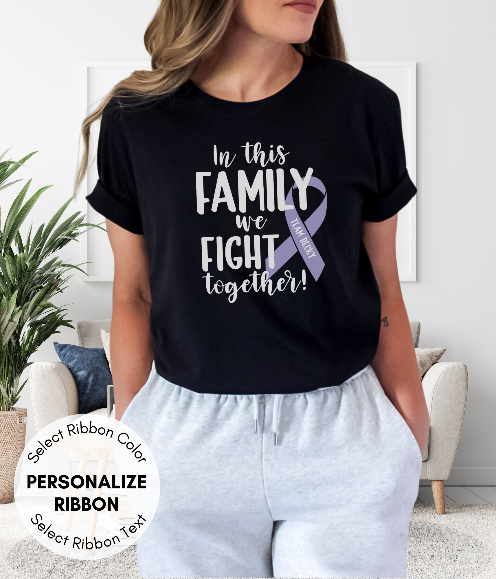 • Support your loved one in style with this Stomach Cancer shirt personalized with their name in the ribbon. Our 'In this Family We Fight Together' unisex tee is the perfect blend of comfort and purpose. Perfect for ordering in bulk to make a large supportive statement.