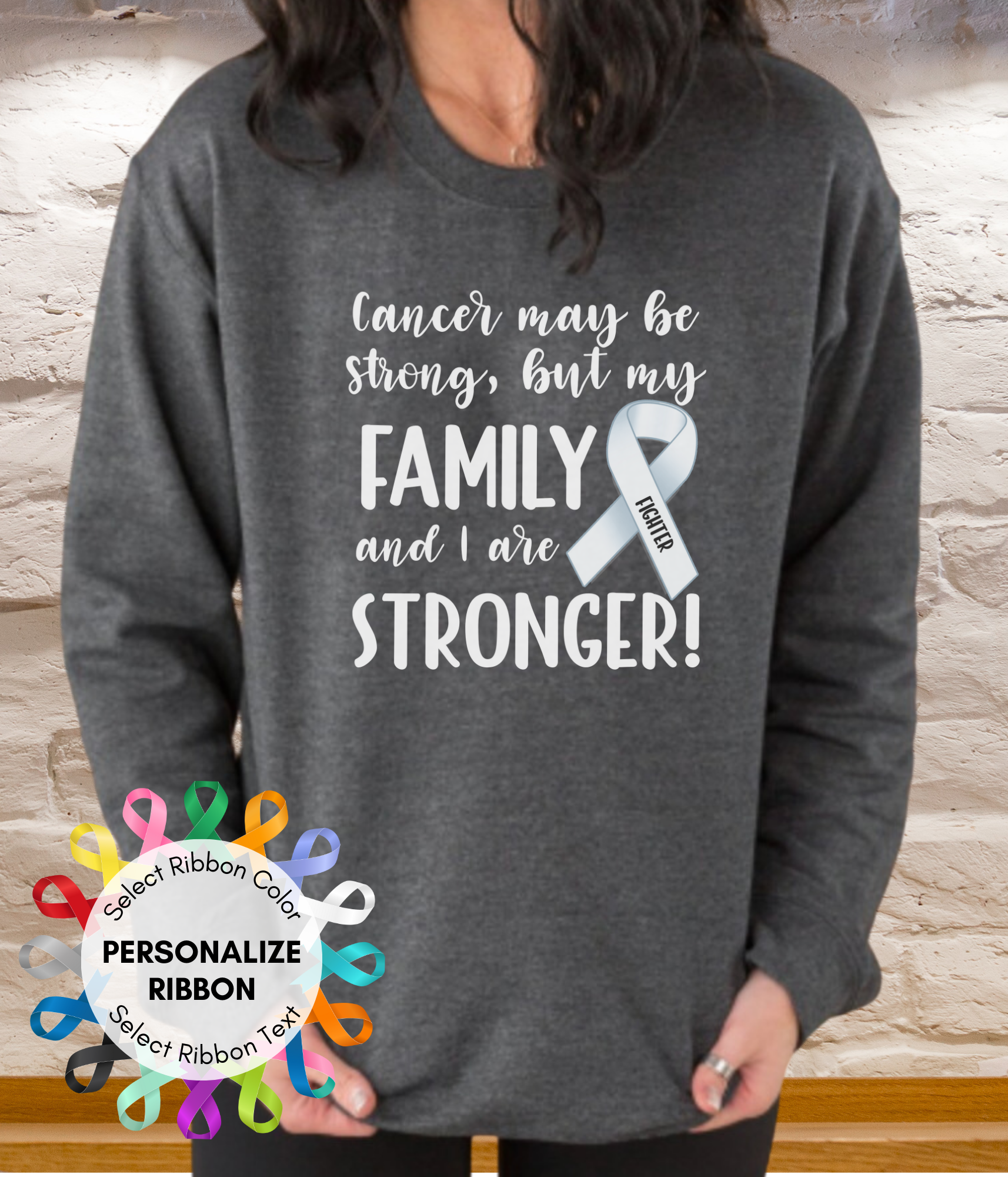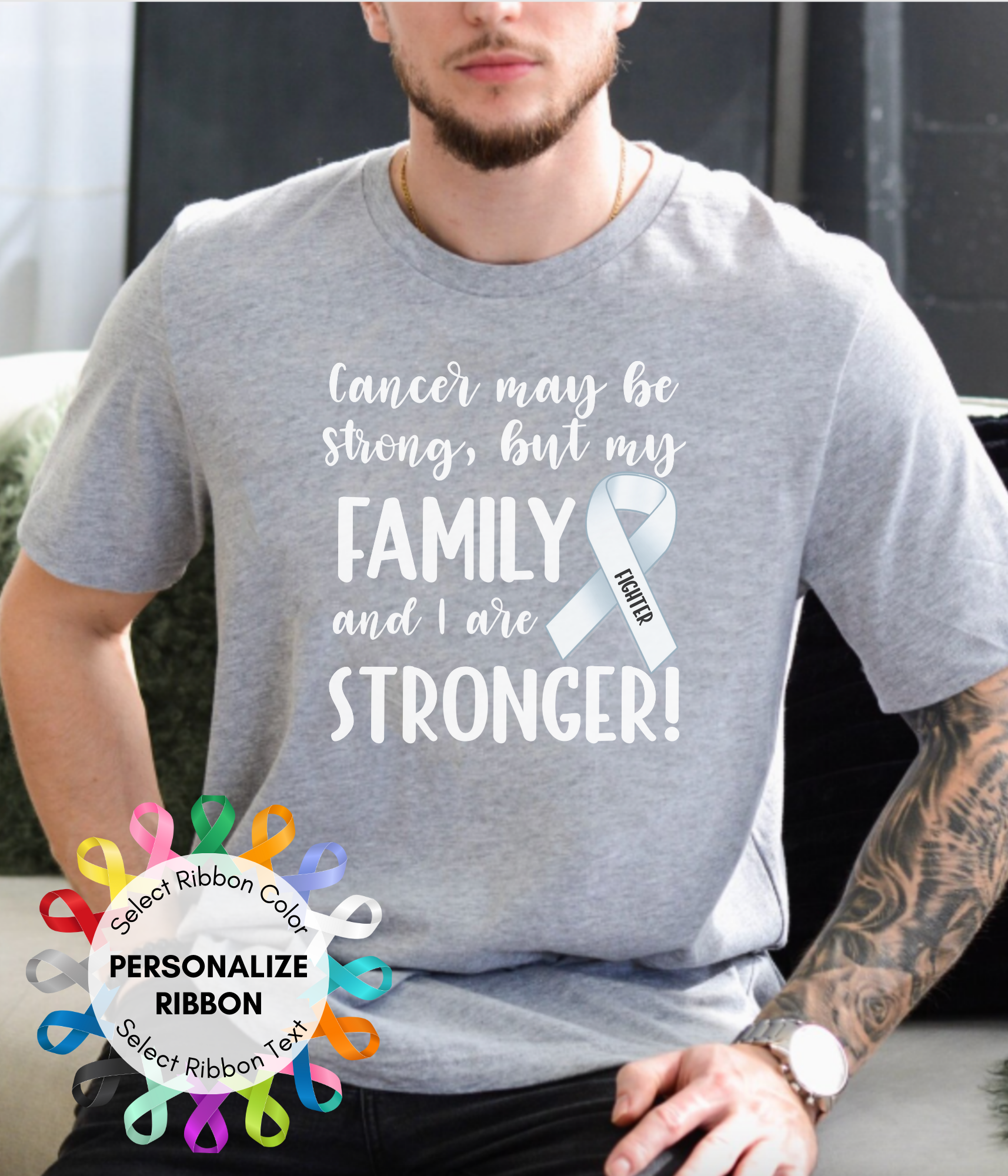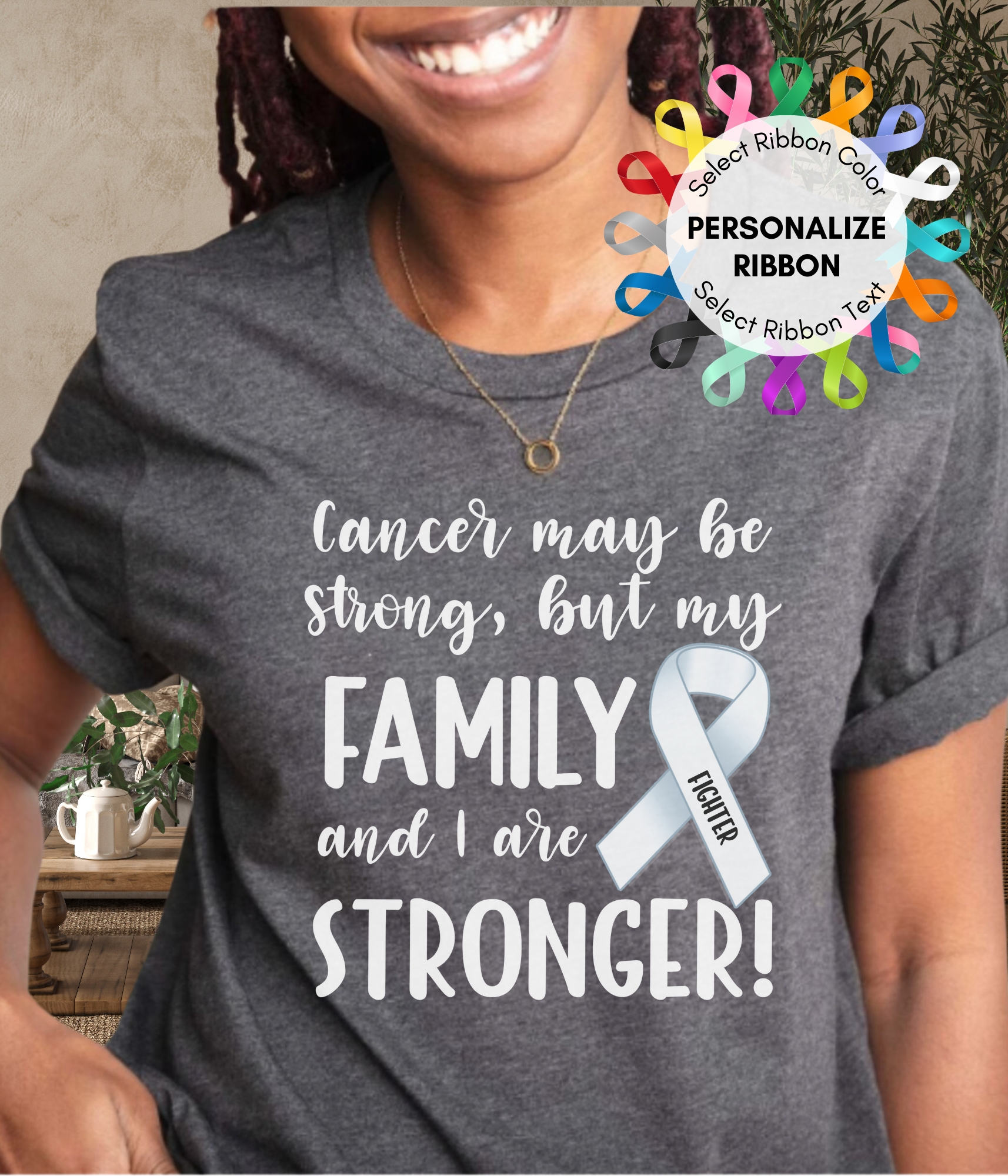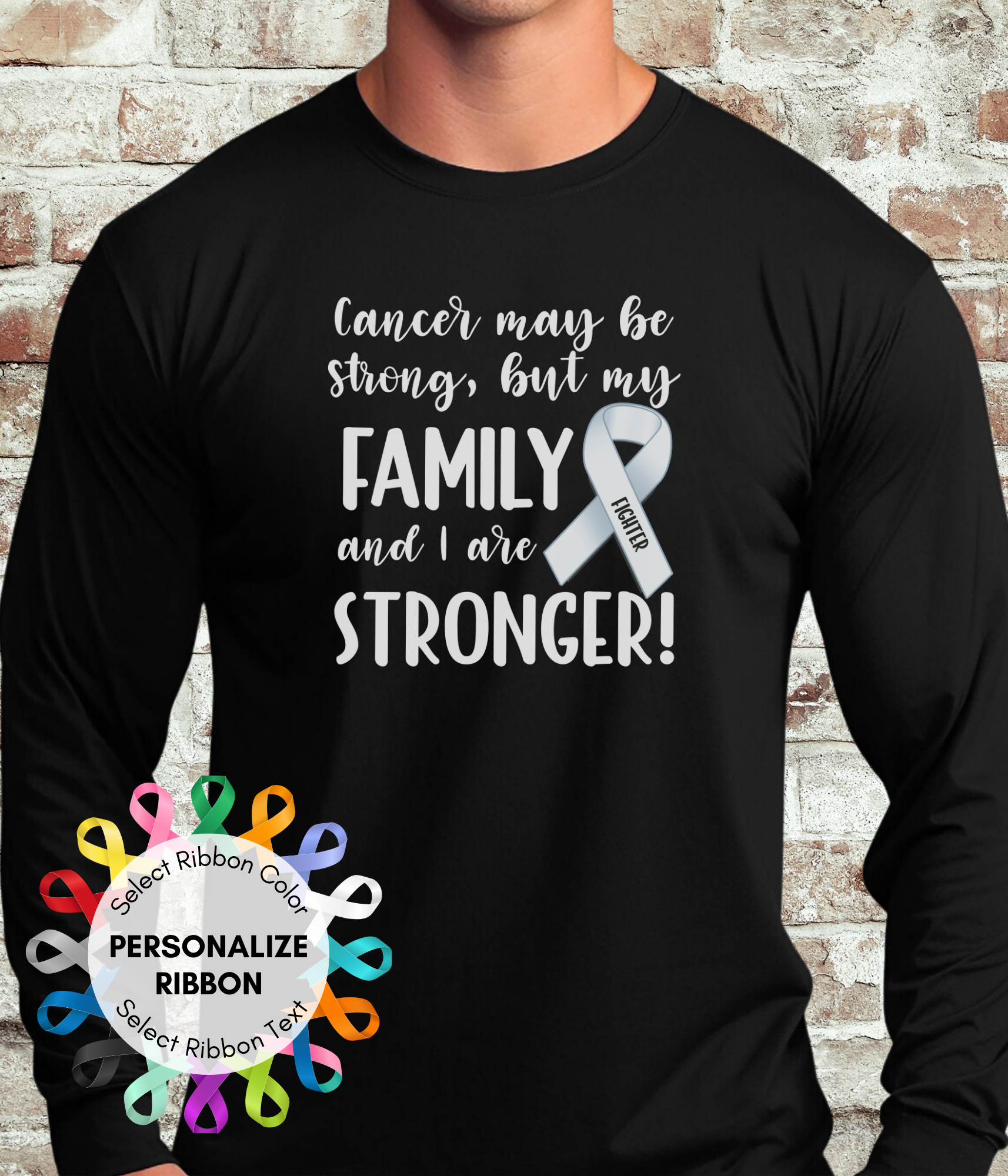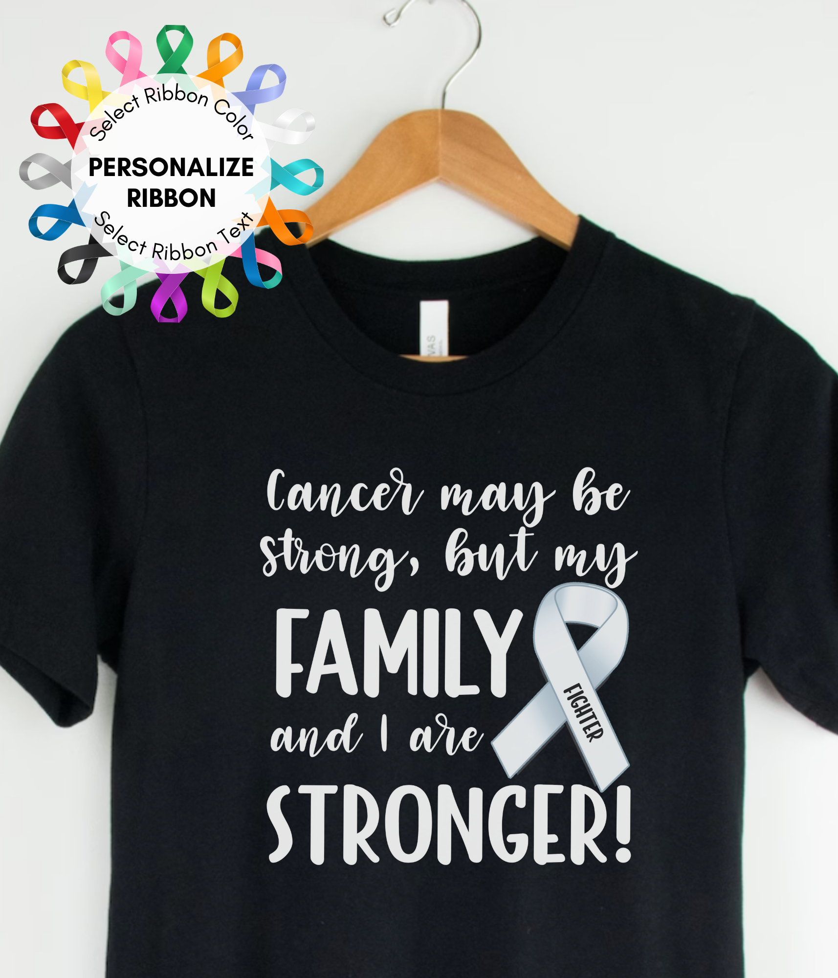 • Show everyone the fighter you are with 'Cancer is Strong, but my Family and I are Stronger!' shirt. Personalize with the ribbon related to your cancer diagnosis, autoimmune diagnosis, or rare disease diagnosis. Show your strength in style with this cancer and disease awareness personalized ribbon shirt. Our 'Stronger' unisex shirt is the perfect blend of comfort and purpose.
